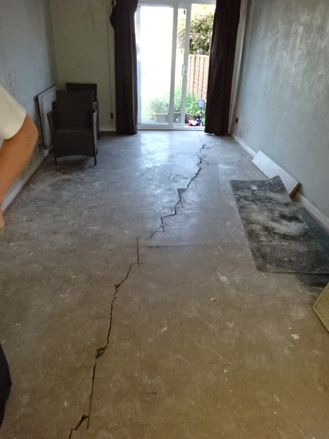The purchaser discovered this large crack across the lounge floor when replacing the carpet. An engineer had suggested that the floor might have fractured due to sulphates in the hardcore attacking the concrete but sulphate attack tends to manifest as small humps and a chemical analysis of the hardcore proved negative for sulphates.